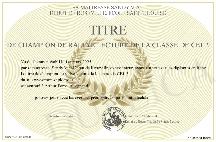 Envoyez par email votre titre de champion de rallye lecture de la classe de CE1 2 personalisé