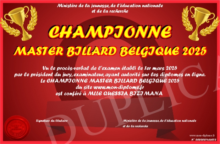Envoyez par email votre CHAMPIONNE MASTER BILLARD BELGIQUE 2025 personalisé