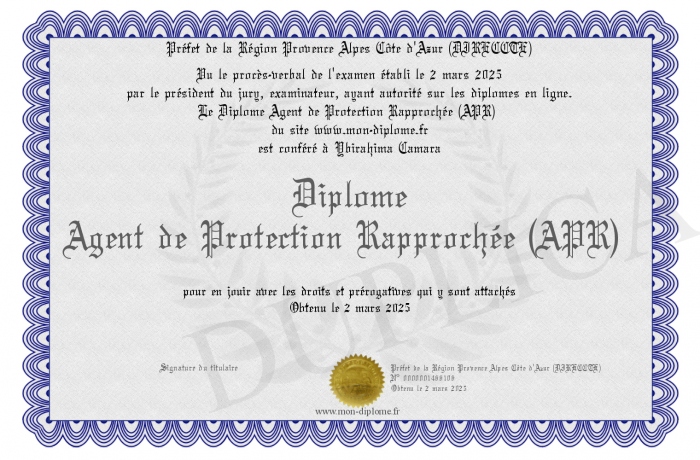 Envoyez par email votre Diplôme Agent de Protection Rapprochée (APR) personalisé