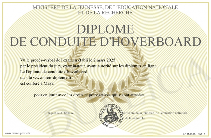 Envoyez par email votre Diplôme de conduite d'hoverboard personalisé