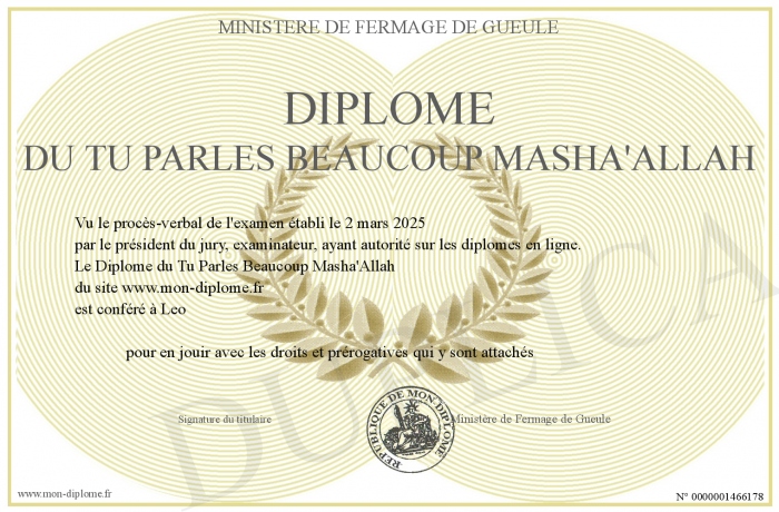 Envoyez par email votre Diplôme du Tu Parles Beaucoup Masha'Allah personalisé