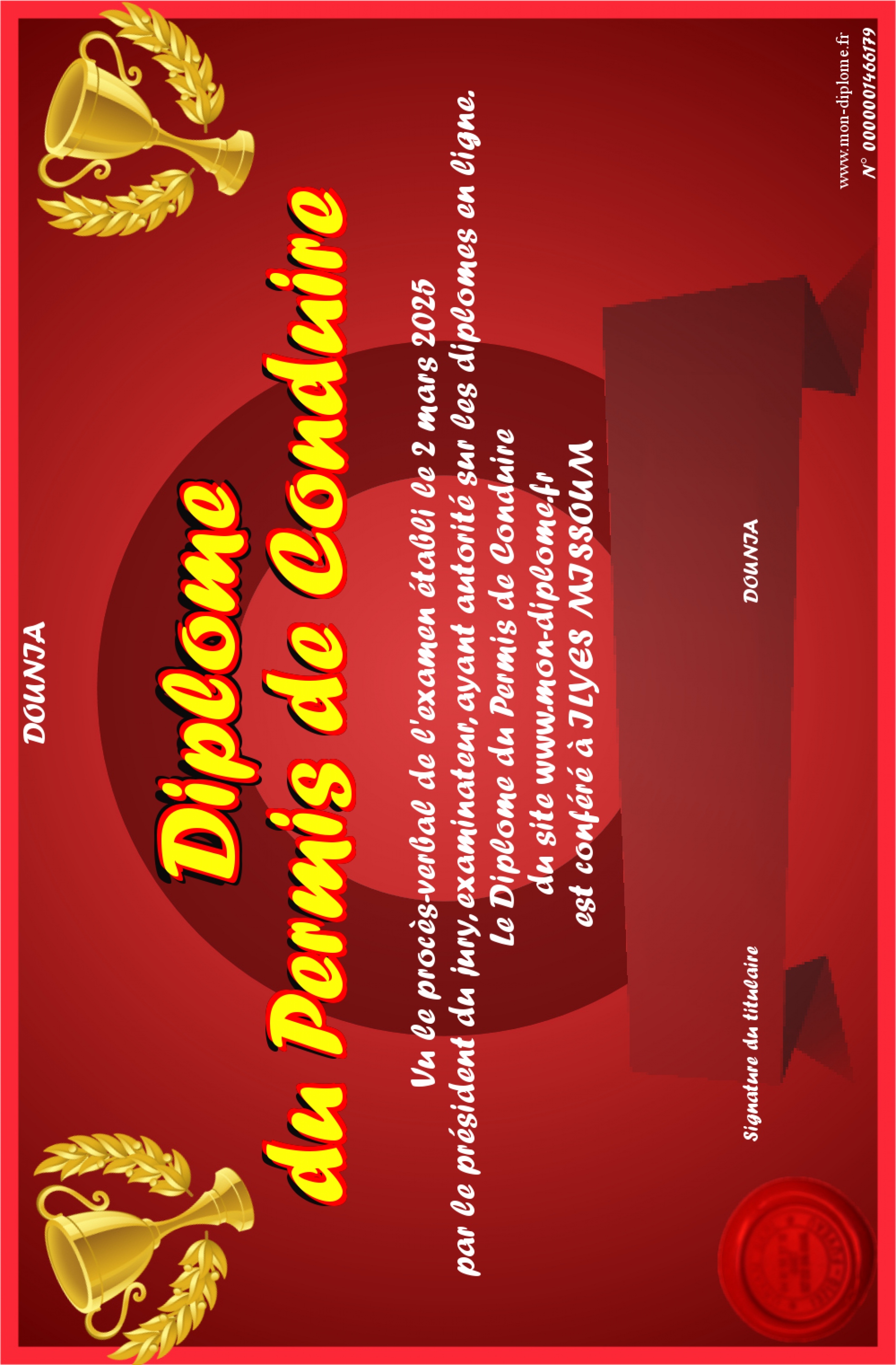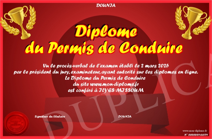 Envoyez par email votre Diplôme du Permis de Conduire personalisé