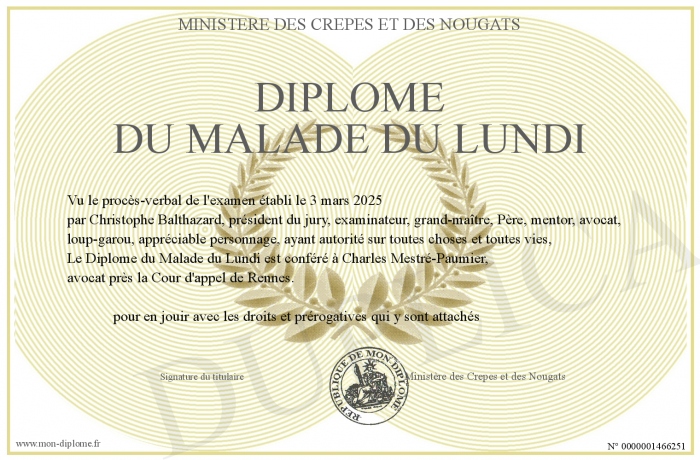 Envoyez par email votre Diplôme du Malade du Lundi personalisé