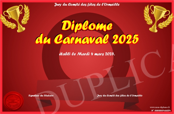 Envoyez par email votre Diplôme du Carnaval 2025 personalisé