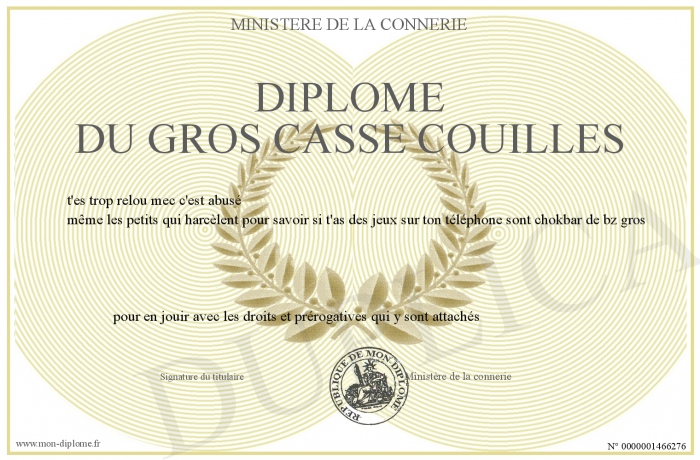 Envoyez par email votre Diplôme du gros casse couilles personalisé