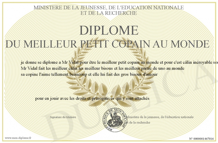 Envoyez par email votre diplome du meilleur petit copain au monde personalisé