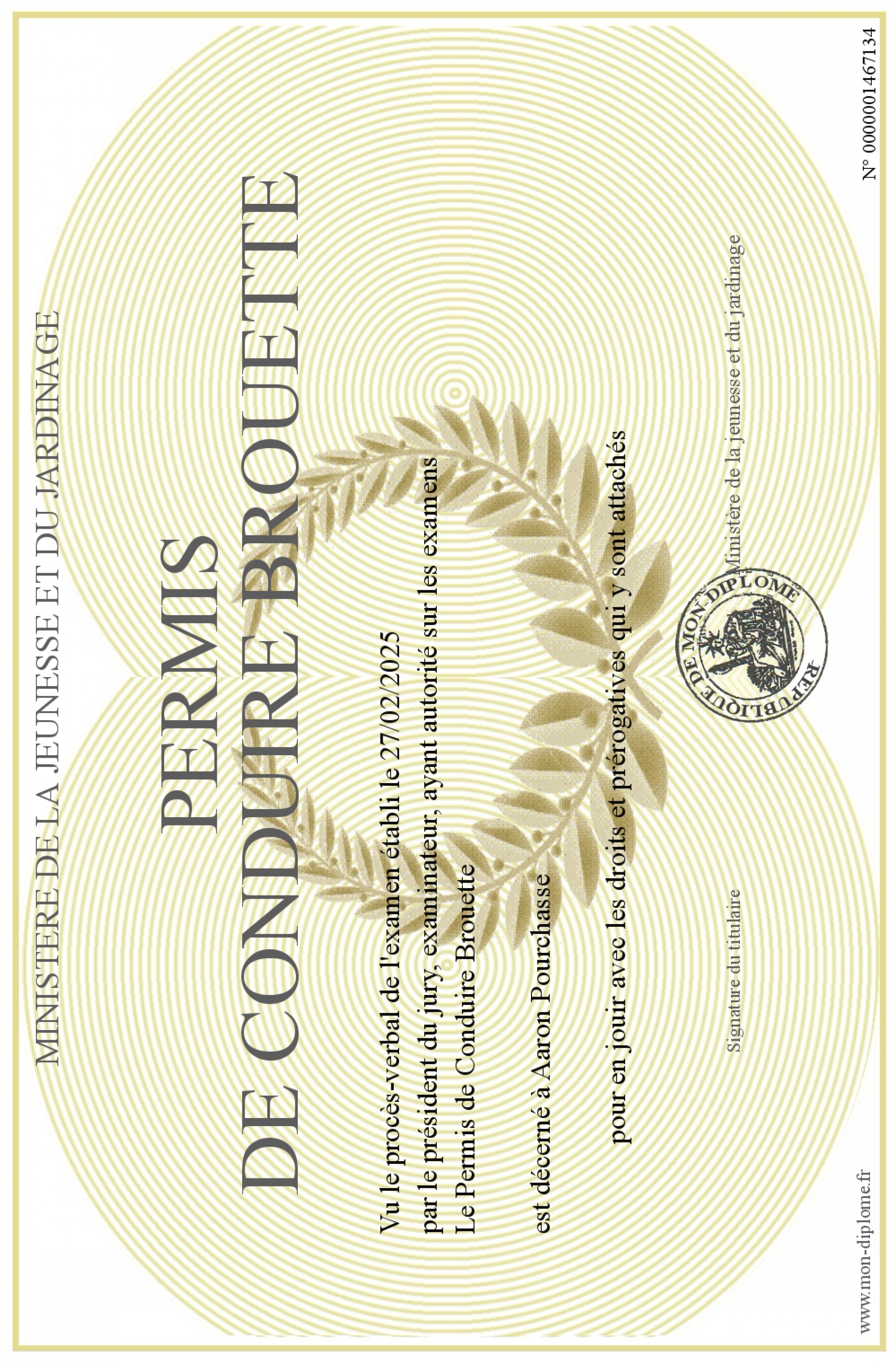 Envoyez par email votre Permis de Conduire Brouette personalisé