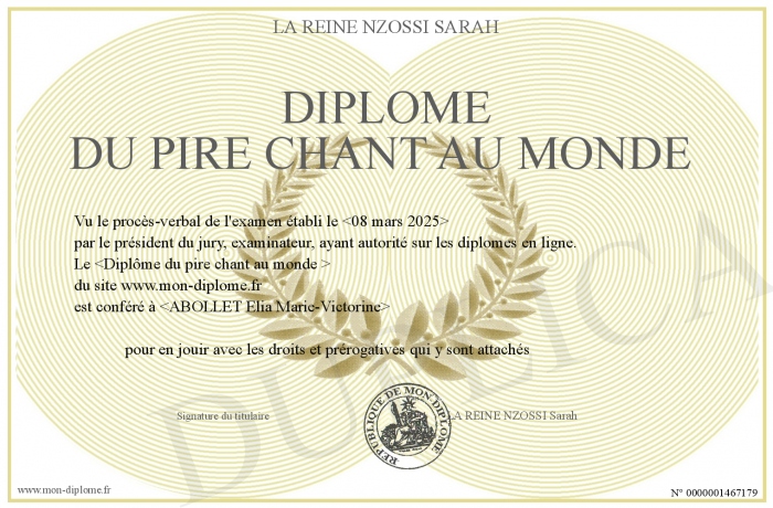 Envoyez par email votre Diplôme du pire chant au monde personalisé