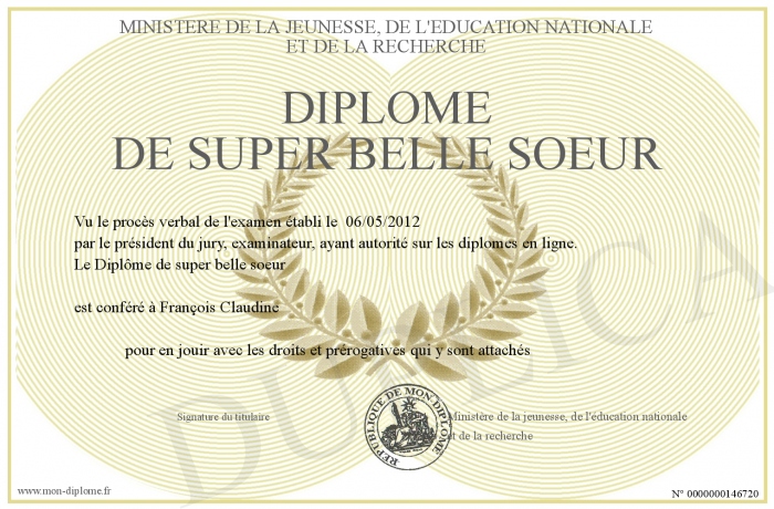 Envoyez par email votre Diplôme de super belle soeur personalisé