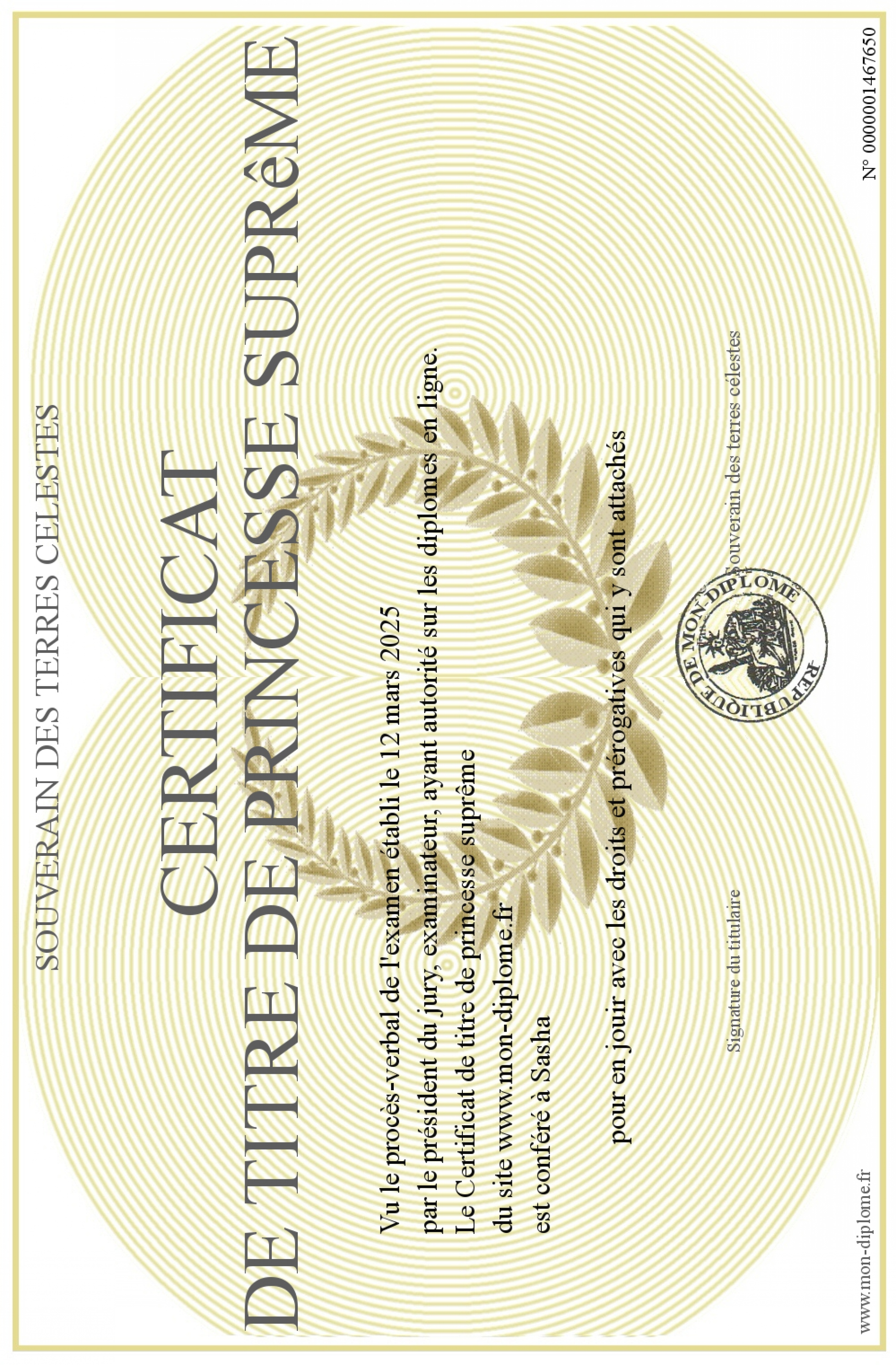 Envoyez par email votre Certificat de titre de princesse suprême personalisé