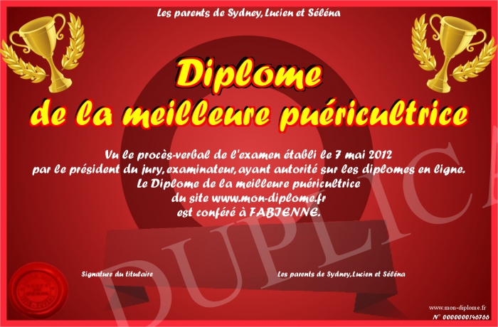 Envoyez par email votre Diplôme de la meilleure puéricultrice personalisé