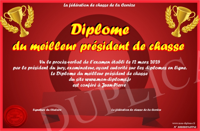Envoyez par email votre Diplôme du meilleur président de chasse personalisé