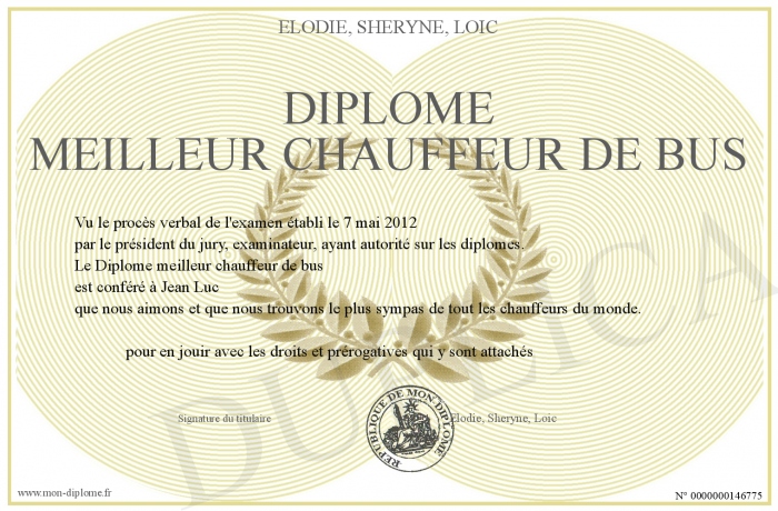 Envoyez par email votre Diplôme meilleur chauffeur de bus personalisé