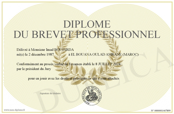 Envoyez par email votre Diplôme du brevet professionnel personalisé