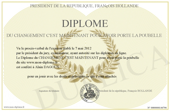 Envoyez par email votre Diplôme du CHANGEMENT C'EST MAINTENANT pour avoir porté la poubelle personalisé