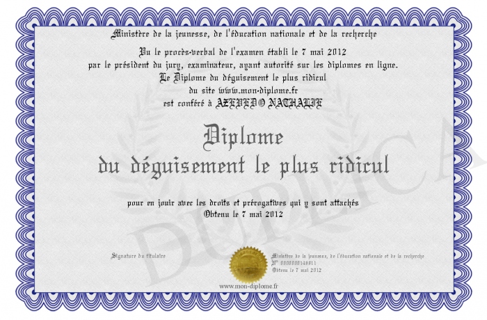 Envoyez par email votre Diplôme du déguisement le plus ridicul personalisé