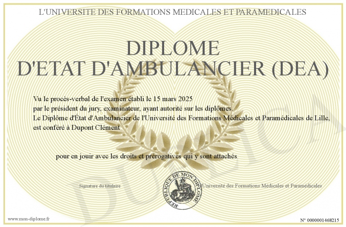 Envoyez par email votre Diplôme d'état d'Ambulancier (DEA) personalisé