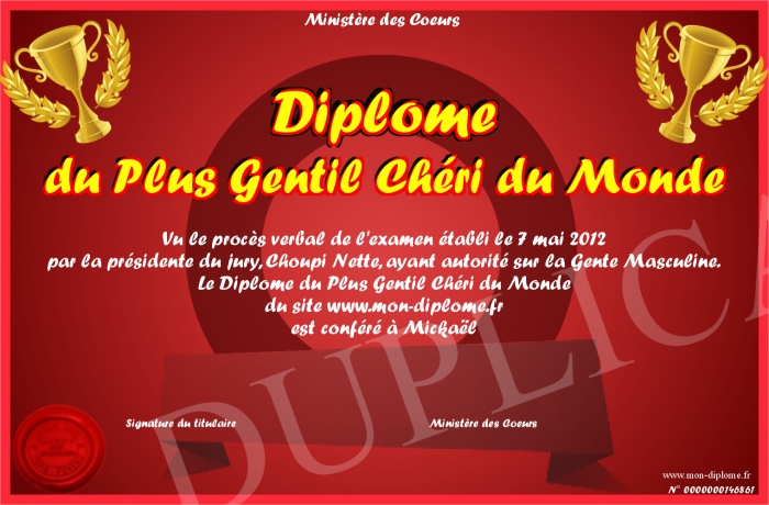 Envoyez par email votre Diplôme du Plus Gentil Chéri du Monde personalisé