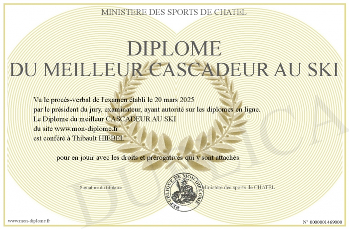 Envoyez par email votre Diplôme du meilleur CASCADEUR AU SKI personalisé