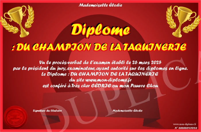 Envoyez par email votre Diplôme : DU CHAMPION DE LA TAQUINERIE personalisé