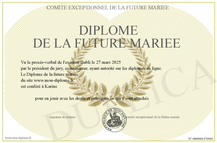 Envoyez par email votre Diplôme de la future mariée personalisé