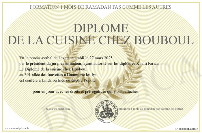 Envoyez par email votre Diplôme de la cuisine chez Bouboul personalisé