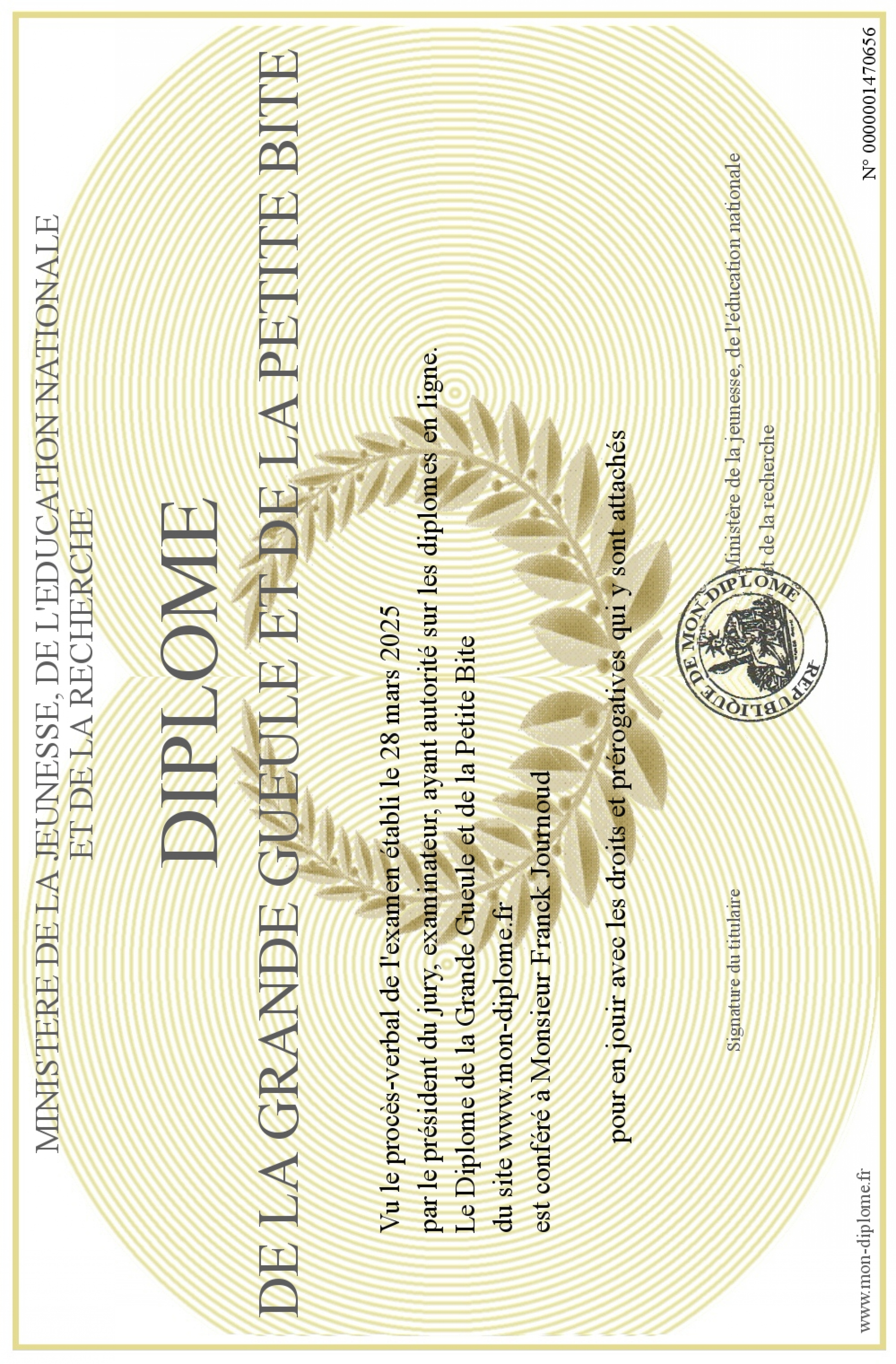 Envoyez par email votre Diplôme de la Grande Gueule et de la Petite Bite personalisé
