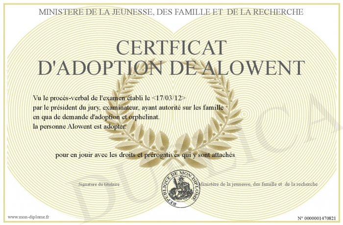 Envoyez par email votre certficat d'adoption de alowent personalisé