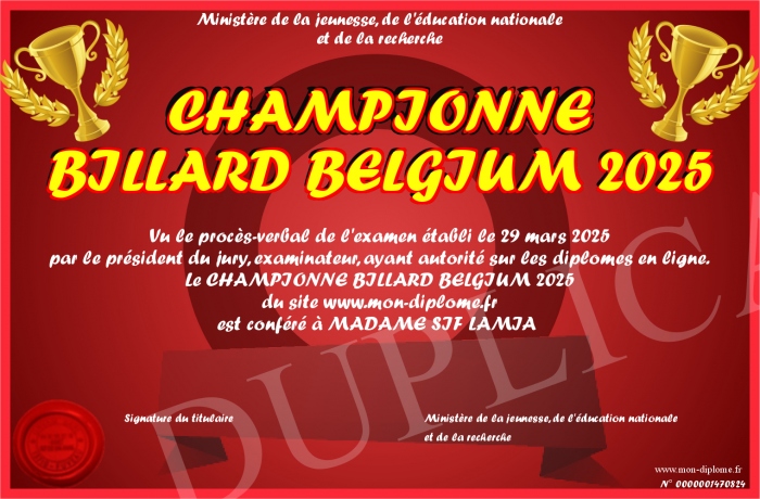 Envoyez par email votre CHAMPIONNE BILLARD BELGIUM 2025 personalisé