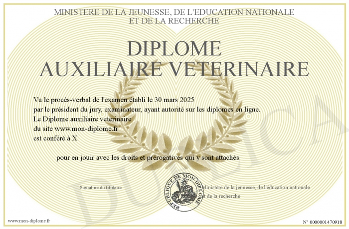 Envoyez par email votre Diplôme auxiliaire veterinaire personalisé
