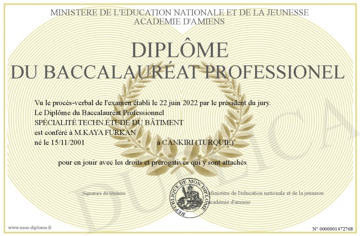 Envoyez par email votre DiplÔme du BACCALAURÉAT PROFESSIONEL personalisé
