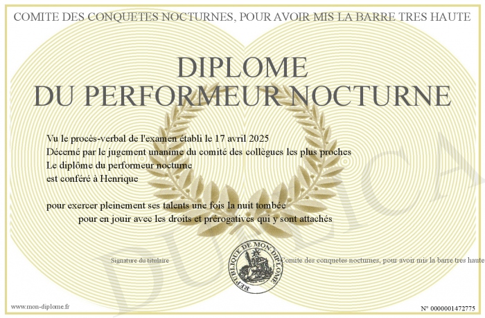 Envoyez par email votre Diplôme du performeur nocturne personalisé