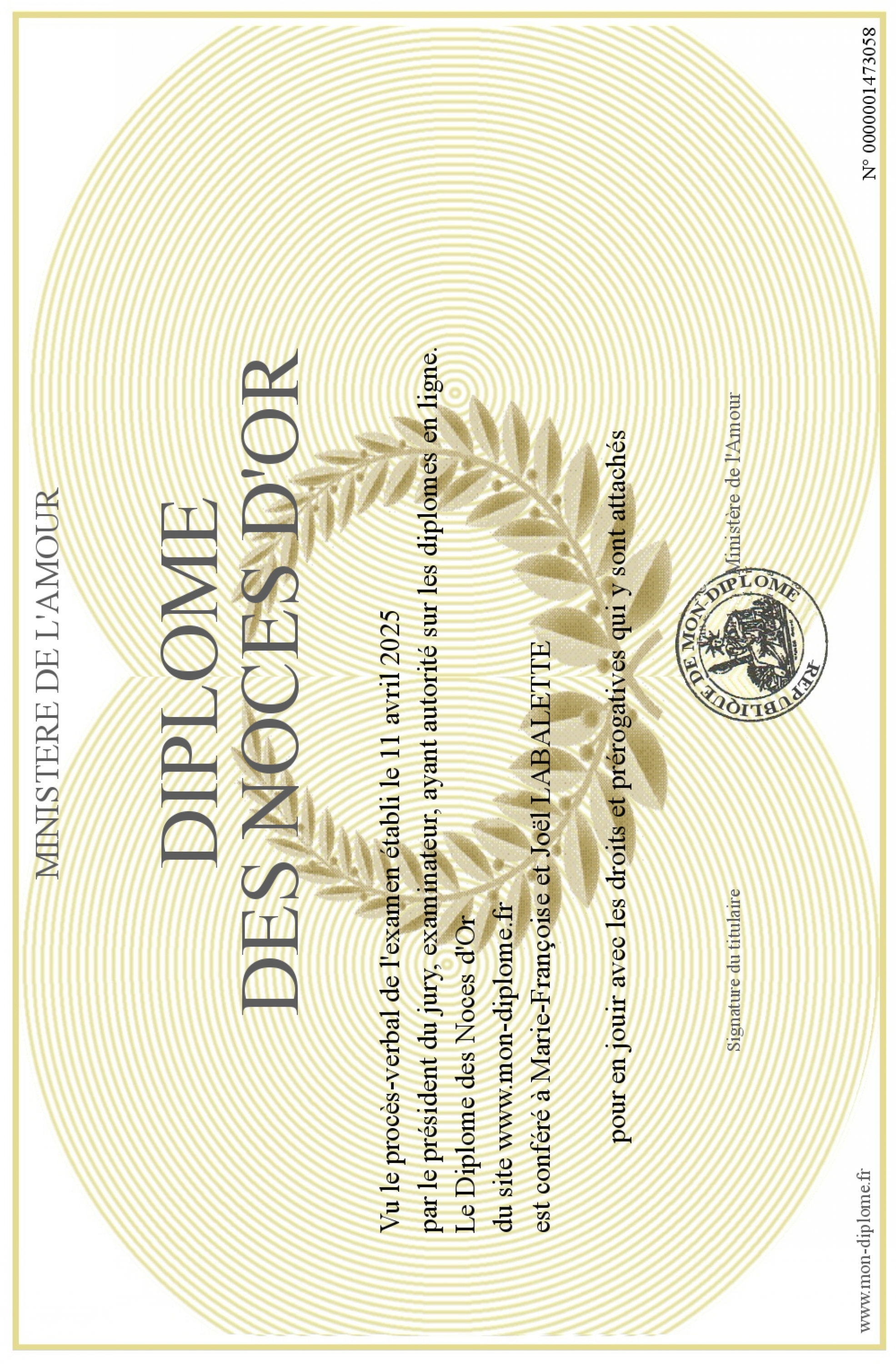 Envoyez par email votre Diplôme des Noces d'Or personalisé