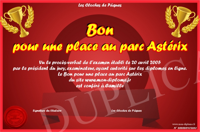 Envoyez par email votre Bon pour une place au parc Astérix personalisé