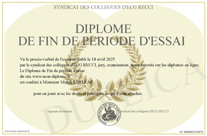 Envoyez par email votre Diplôme de Fin de période d'essai personalisé