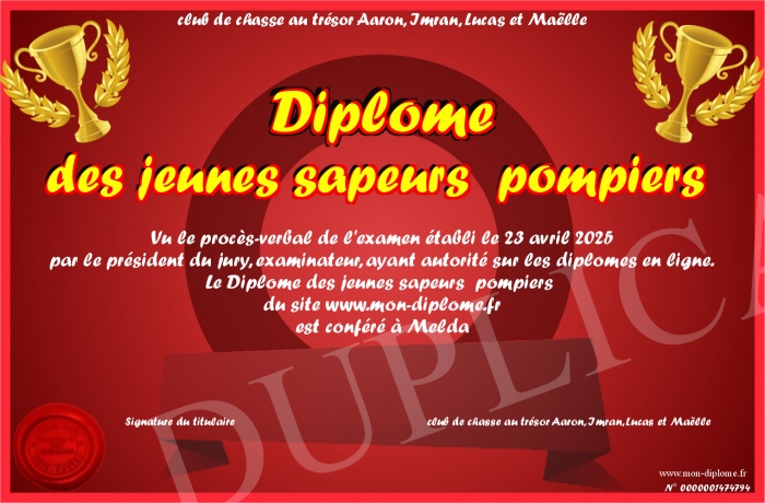 Envoyez par email votre Diplôme des jeunes sapeurs pompiers personalisé