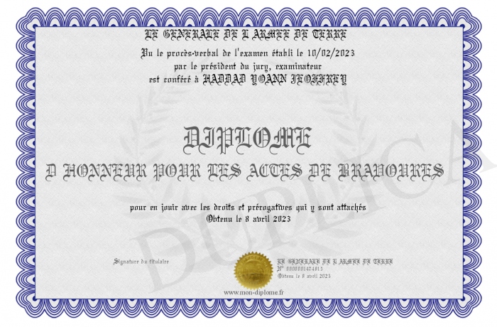 Envoyez par email votre DIPLOME D HONNEUR POUR LES ACTES DE BRAVOURES personalisé