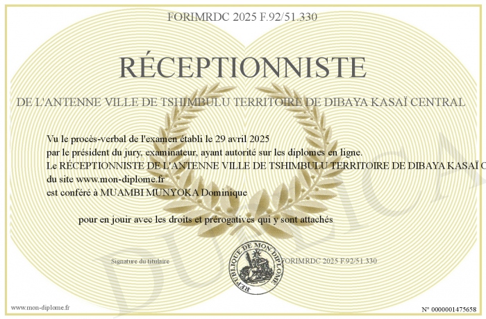 Envoyez par email votre RÉCEPTIONNISTE DE L'ANTENNE VILLE DE TSHIMBULU TERRITOIRE DE DIBAYA KASAÏ CENTRAL personalisé