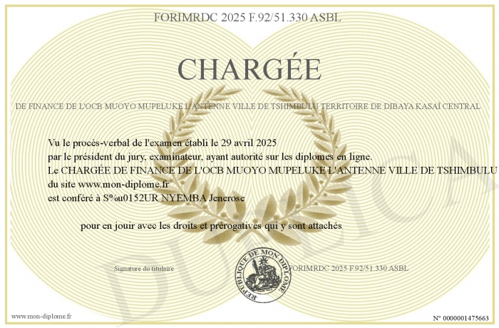 Envoyez par email votre CHARGÉE DE FINANCE DE L'OCB MUOYO MUPELUKE L'ANTENNE VILLE DE TSHIMBULU TERRITOIRE DE DIBAYA KASAÏ CENTRAL personalisé