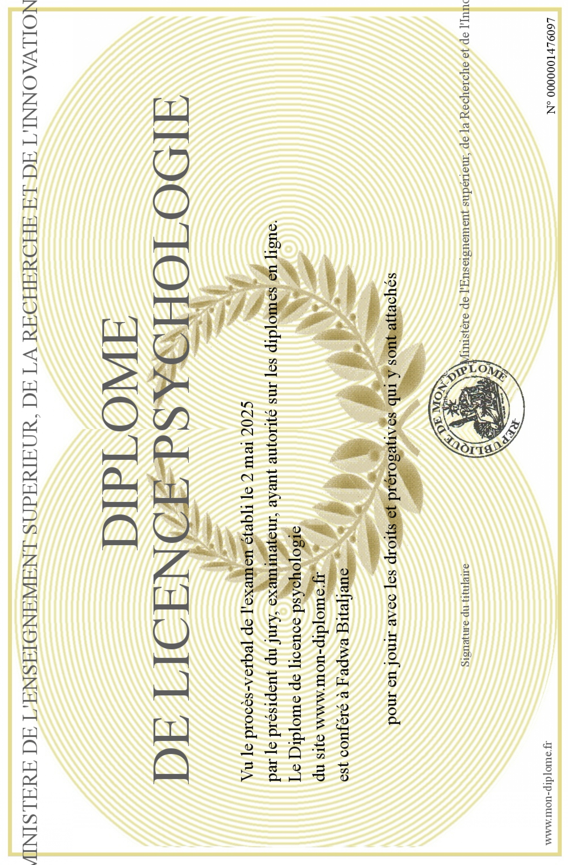 Envoyez par email votre Diplôme de licence psychologie personalisé