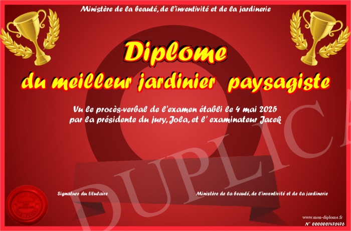 Envoyez par email votre Diplôme du meilleur jardinier paysagiste personalisé