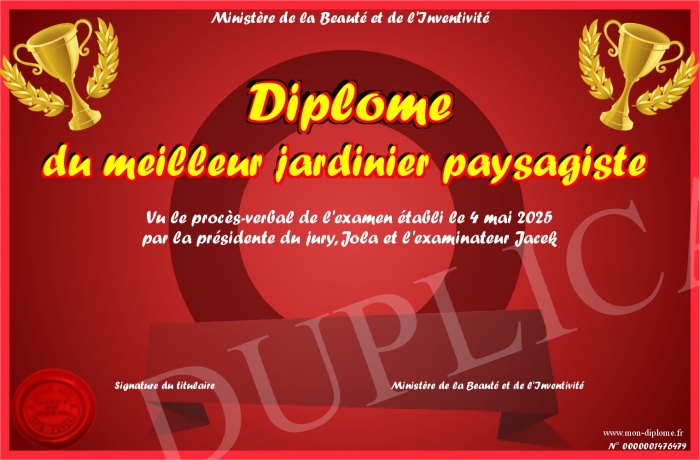 Envoyez par email votre Diplôme du meilleur jardinier paysagiste personalisé