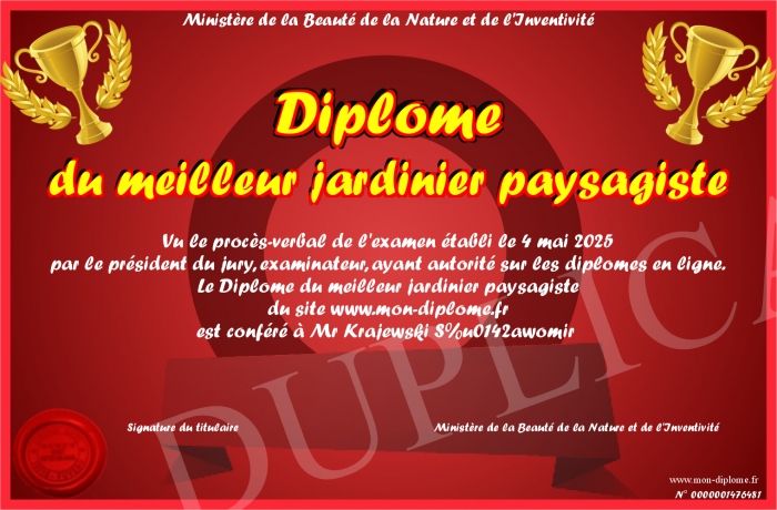 Envoyez par email votre Diplôme du meilleur jardinier paysagiste personalisé