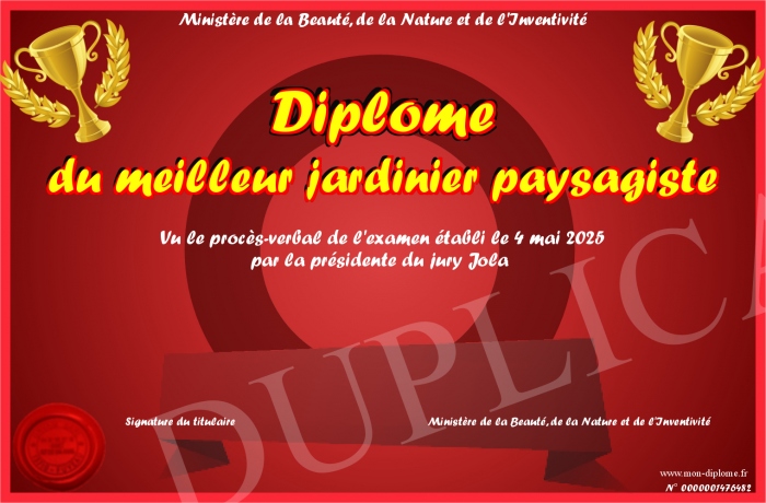 Envoyez par email votre Diplôme du meilleur jardinier paysagiste personalisé