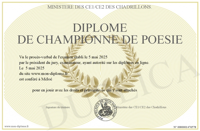 Envoyez par email votre Diplôme de championne de poésie personalisé