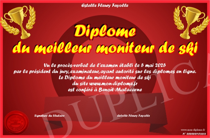 Envoyez par email votre Diplôme du meilleur moniteur de ski personalisé