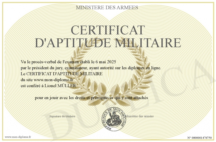 Envoyez par email votre CERTIFICAT D'APTITUDE MILITAIRE personalisé