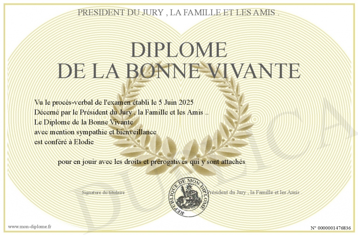 Envoyez par email votre Diplôme de la Bonne Vivante personalisé