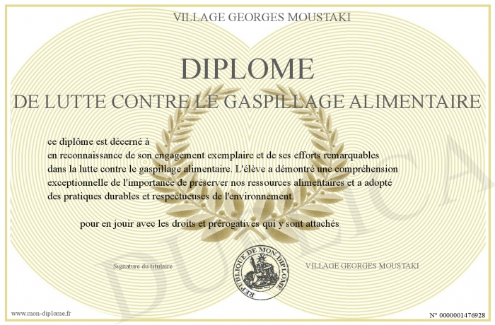 Envoyez par email votre DIPLOME DE LUTTE CONTRE LE GASPILLAGE ALIMENTAIRE personalisé