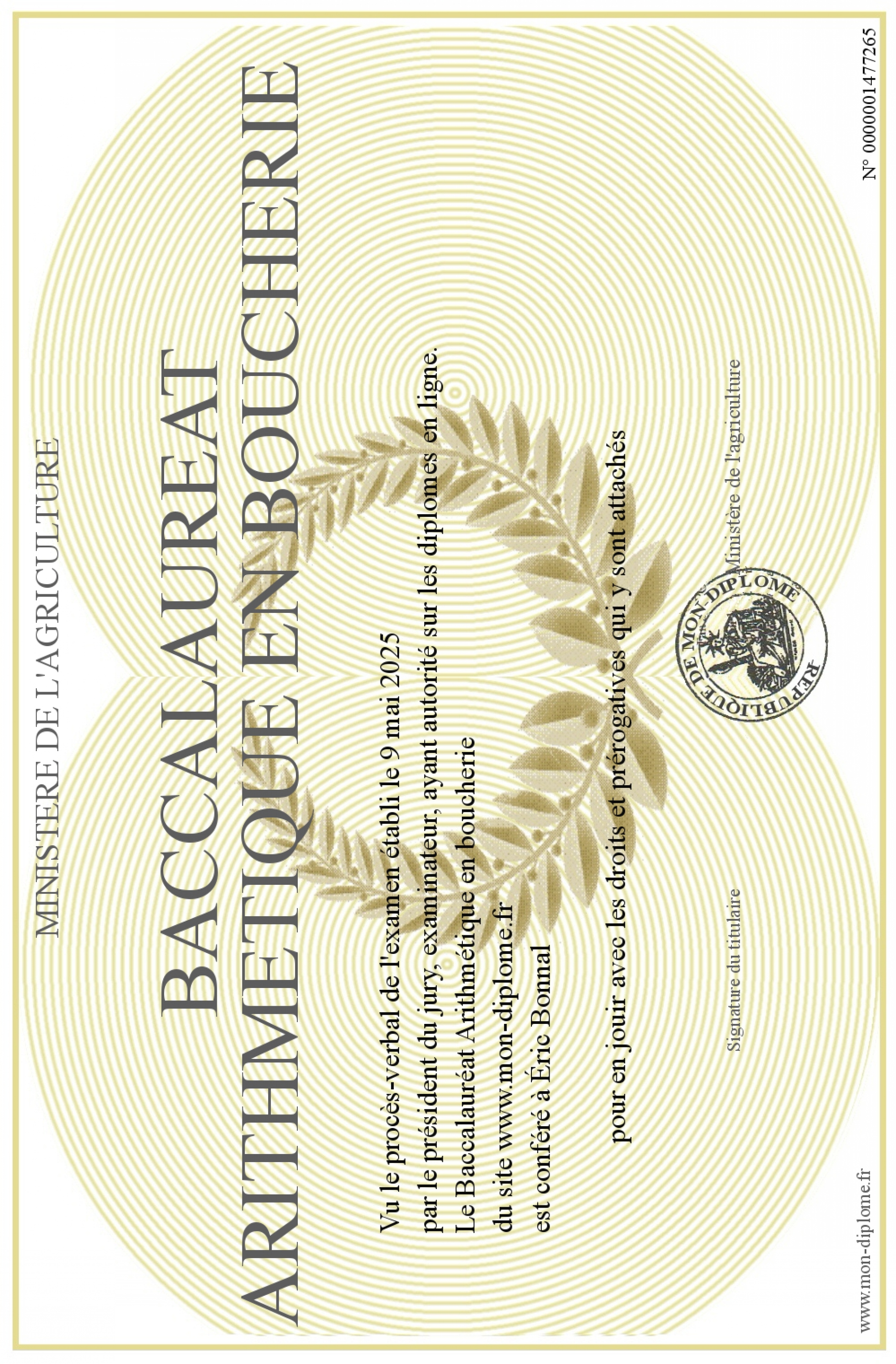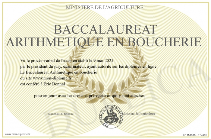Envoyez par email votre Baccalauréat Arithmétique en boucherie personalisé